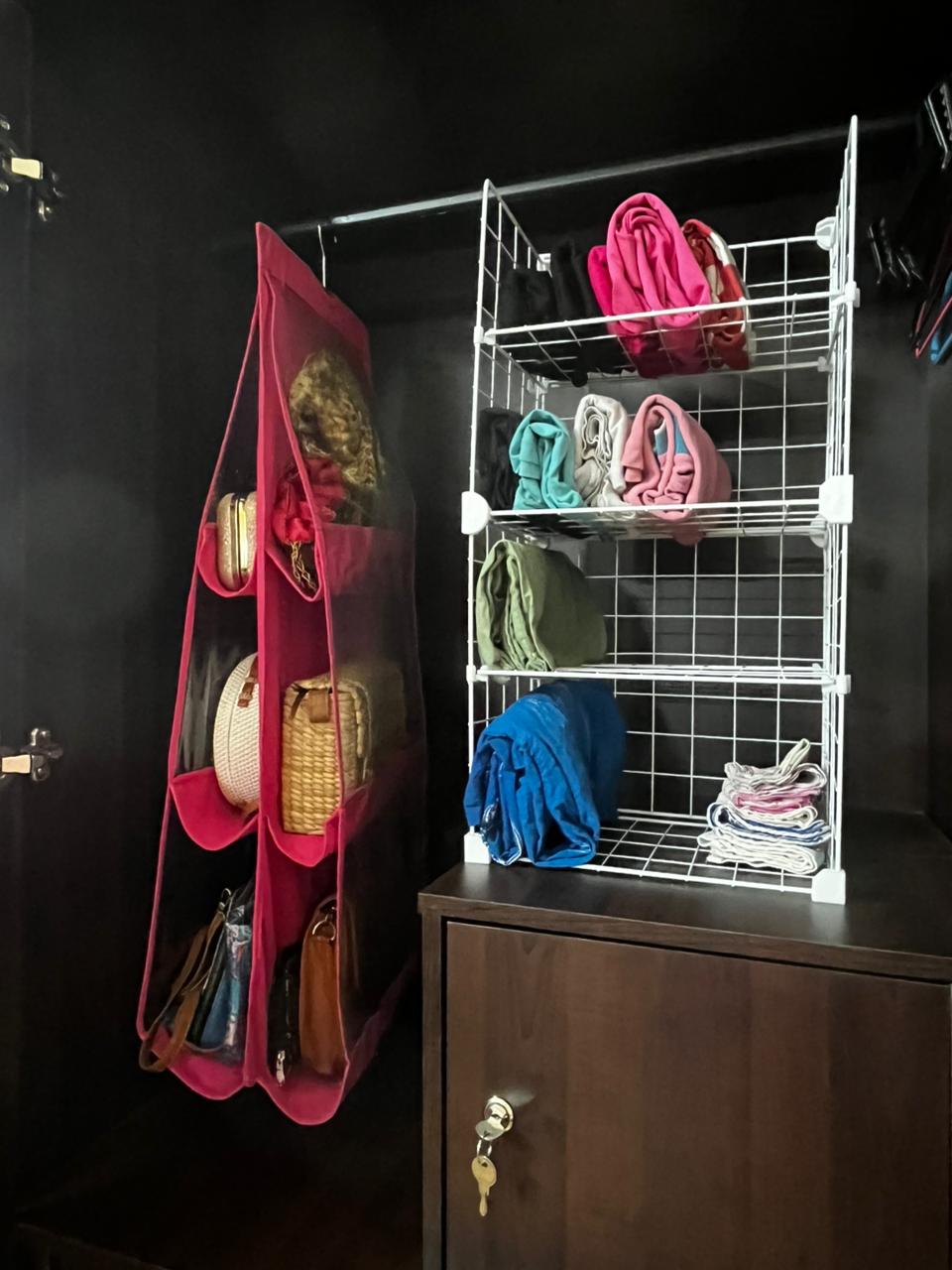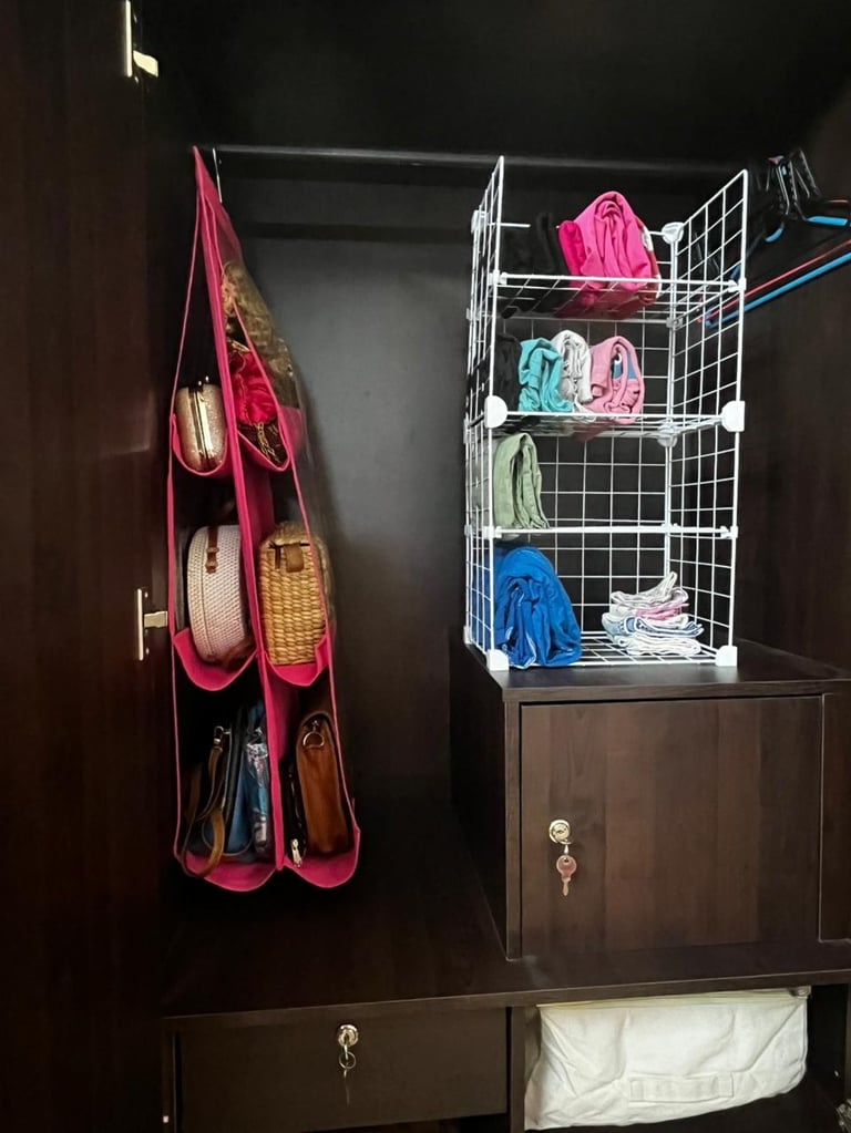 In the image below, you’ll notice a hanging pocket organizer that beautifully utilizes the vertical height of the wardrobe to store different bags & purses.