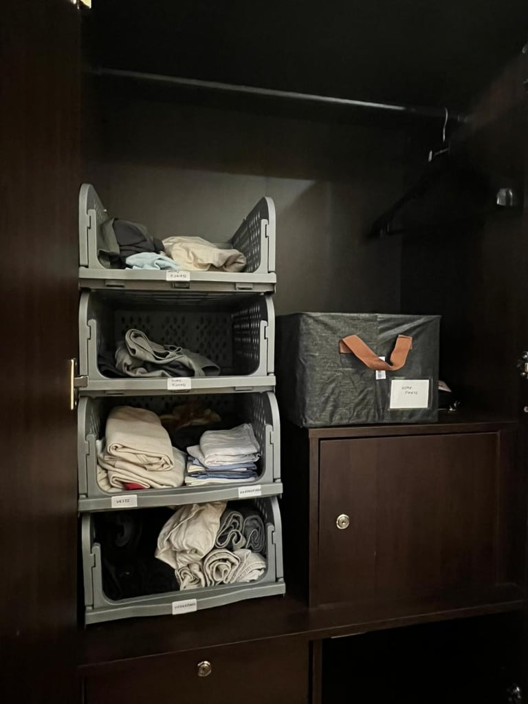 In the image below, I’ve used stackable plastic shelves inside a wardrobe to neatly store clothes separated by categories. Each shelf acts like a dedicated zone, making everything easy to see and access.